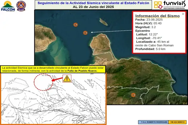 Paraguaná, estado Falcón.- A las 5:40 am de este lunes 23 de junio, se registró un sismo de magnitud 3.2 al oeste del Cabo San Román, municipio Falcón.
